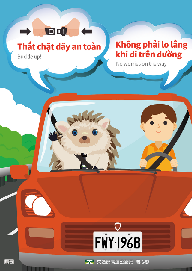 為向外籍用路人宣導國道行車安全觀念,交通部高速公路局製作外語宣導圖卡,歡迎各單位索取協助宣導。