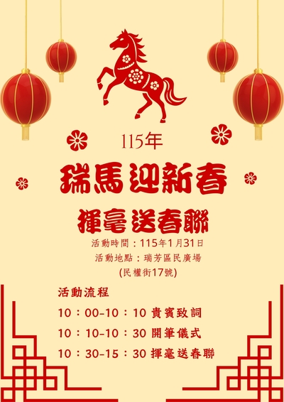 春節將至,新北市瑞芳區公所與瑞芳書道學會於1月31日(六)上午10時至下午3時於瑞芳區民廣場(瑞芳區民權街17號)舉辦「瑞馬迎新春—揮毫贈春聯」活動,特別邀請國內書法名家林聰明等多位書法家一同揮毫贈春聯,不僅可以選取各式各樣風格的春聯,還有客製化寫吉祥佳句、在春聯畫上馬年圖案增添趣味。另外本所亦邀請瑞芳分局、消防局第六大隊瑞芳分隊、瑞芳清潔隊聯合宣導,其中清潔隊另辦理資源回收物換好禮及二手跳蚤市場,各攤位皆提供豐富的宣導品,數量有限,送完為止!