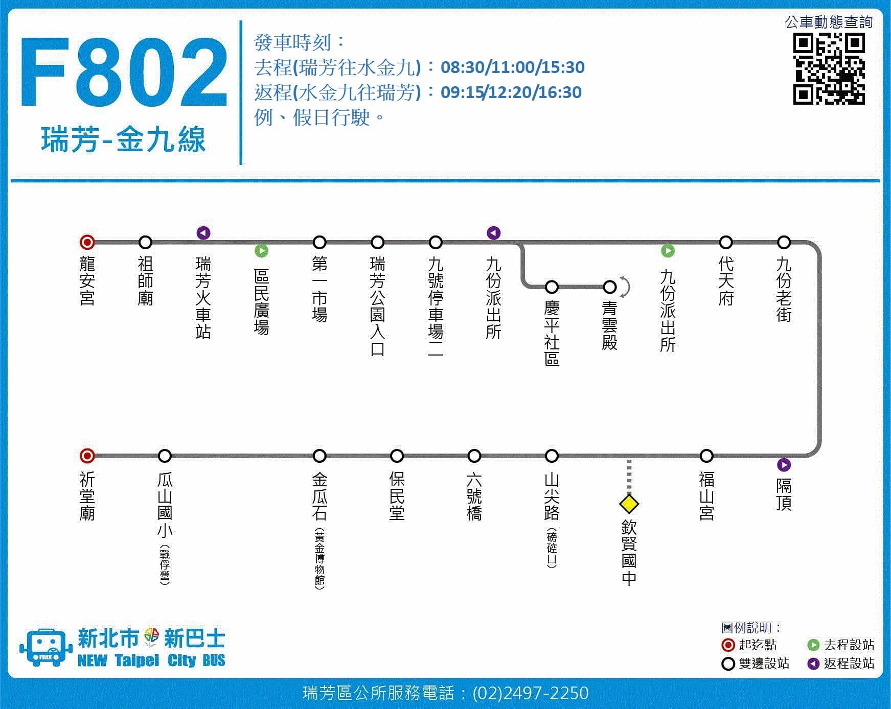 F802瑞芳-金九線:去程(瑞芳往水金九)08:30、11:00、15:30;返程(水金九往瑞芳)09:15、12:20、16:30
