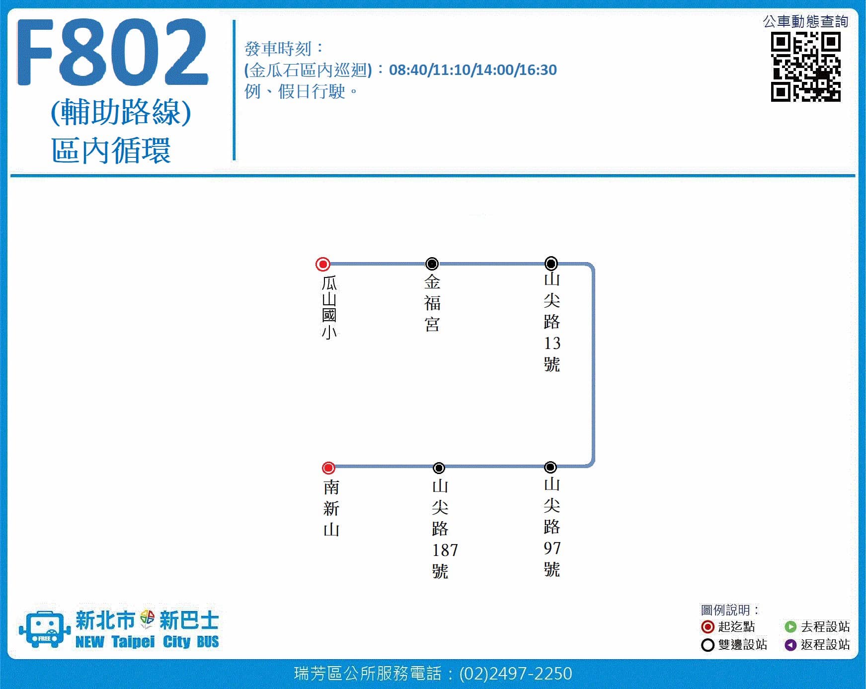 F802(輔助路線)區內巡循:(金瓜石區內巡迴)08:40、11:10、14:00、16:30