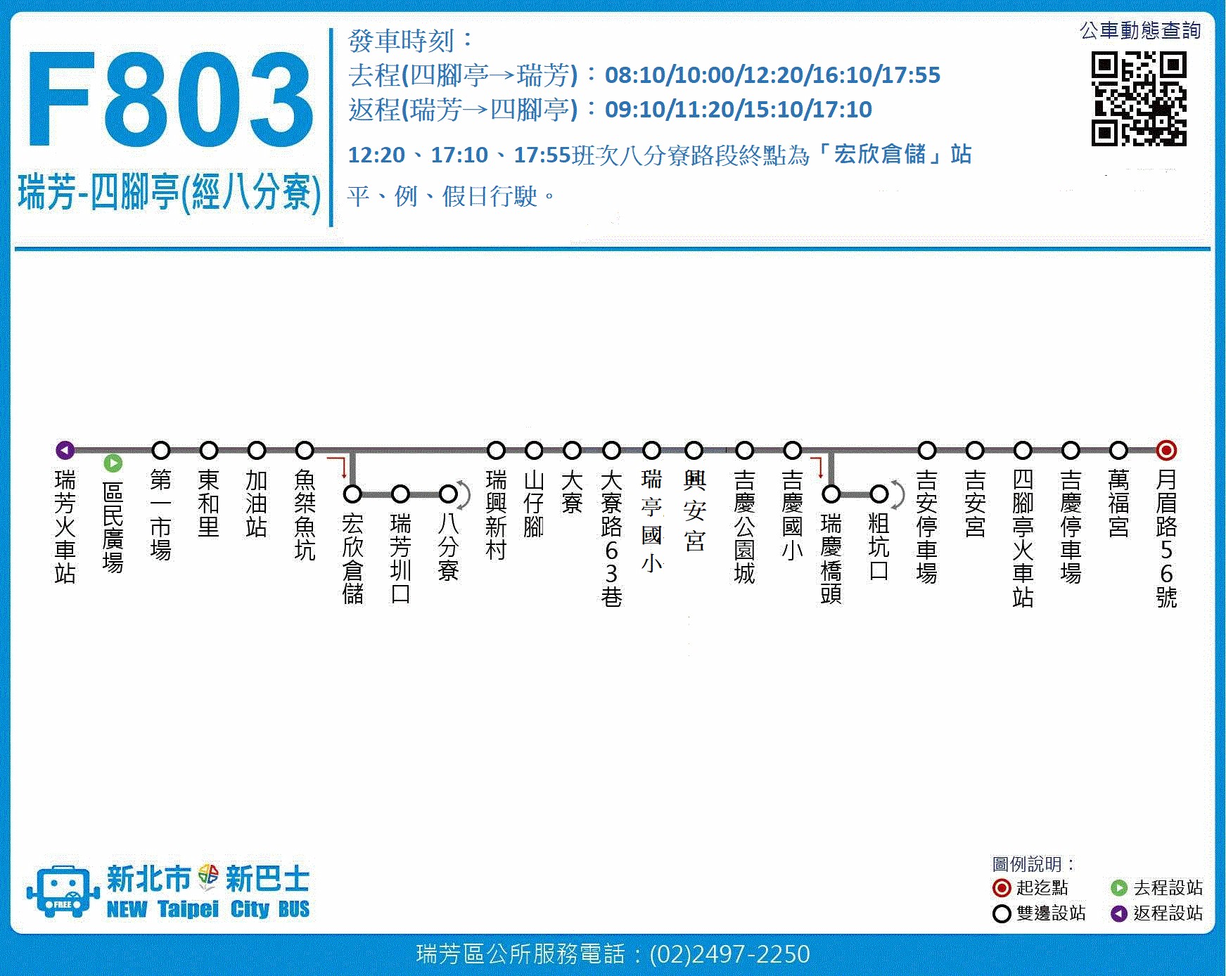 F803瑞芳-四腳亭(經八分寮):去程(四腳亭->瑞芳)08:10、10:00、12:20、16:10、17:55;返程(瑞芳->四腳亭)09:10、11:20、15:10、17:10