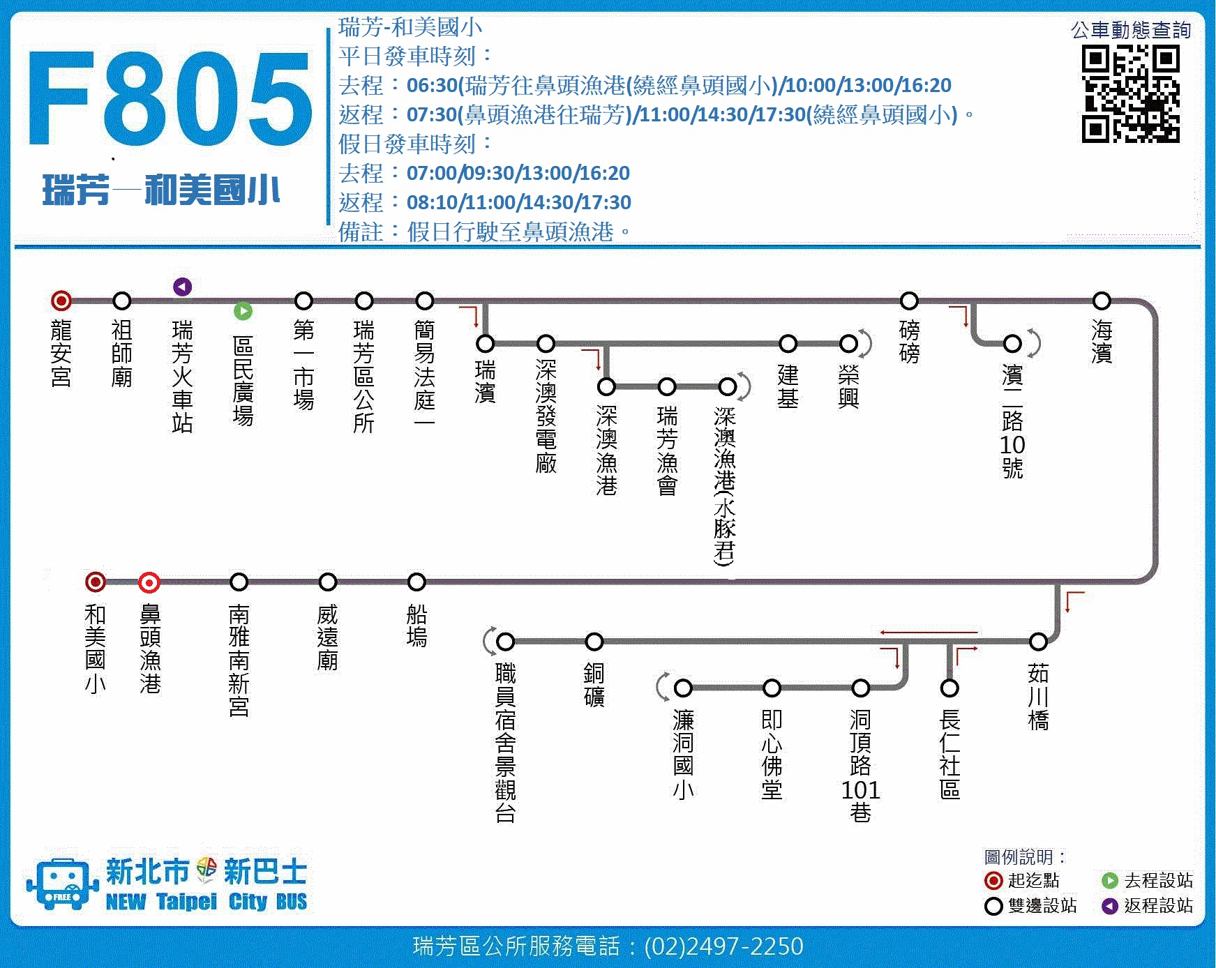 F805瑞芳-和美國小:去程平日06:30(瑞芳往鼻頭漁港繞經鼻頭國小)10:00、13:00、16:20 假日07:00、09:30、13:00、16:20;返程平日0730:(鼻頭漁港往瑞芳)11:00、14:30、17:30(繞經鼻頭國小) 假日08:10、11:00、14:30、17:30