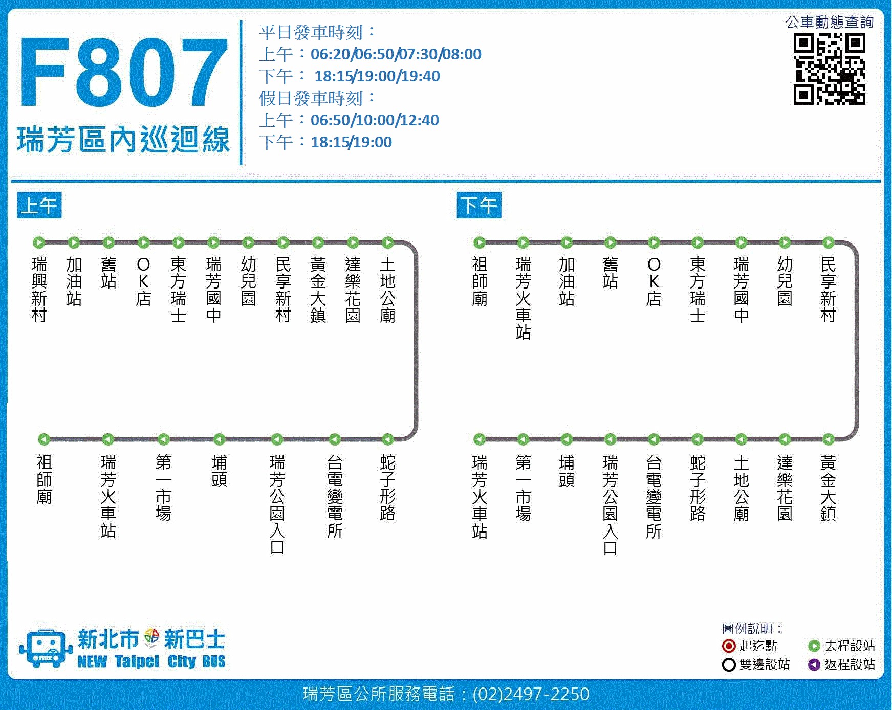 F807瑞芳區內巡迴線:(平日上午)06:20、06:50、07:30、08:00 (假日上午)06:50、10:00、12:40;(平日下午)18:15、19:00、19:40 (假日下午)18:15、19:00
