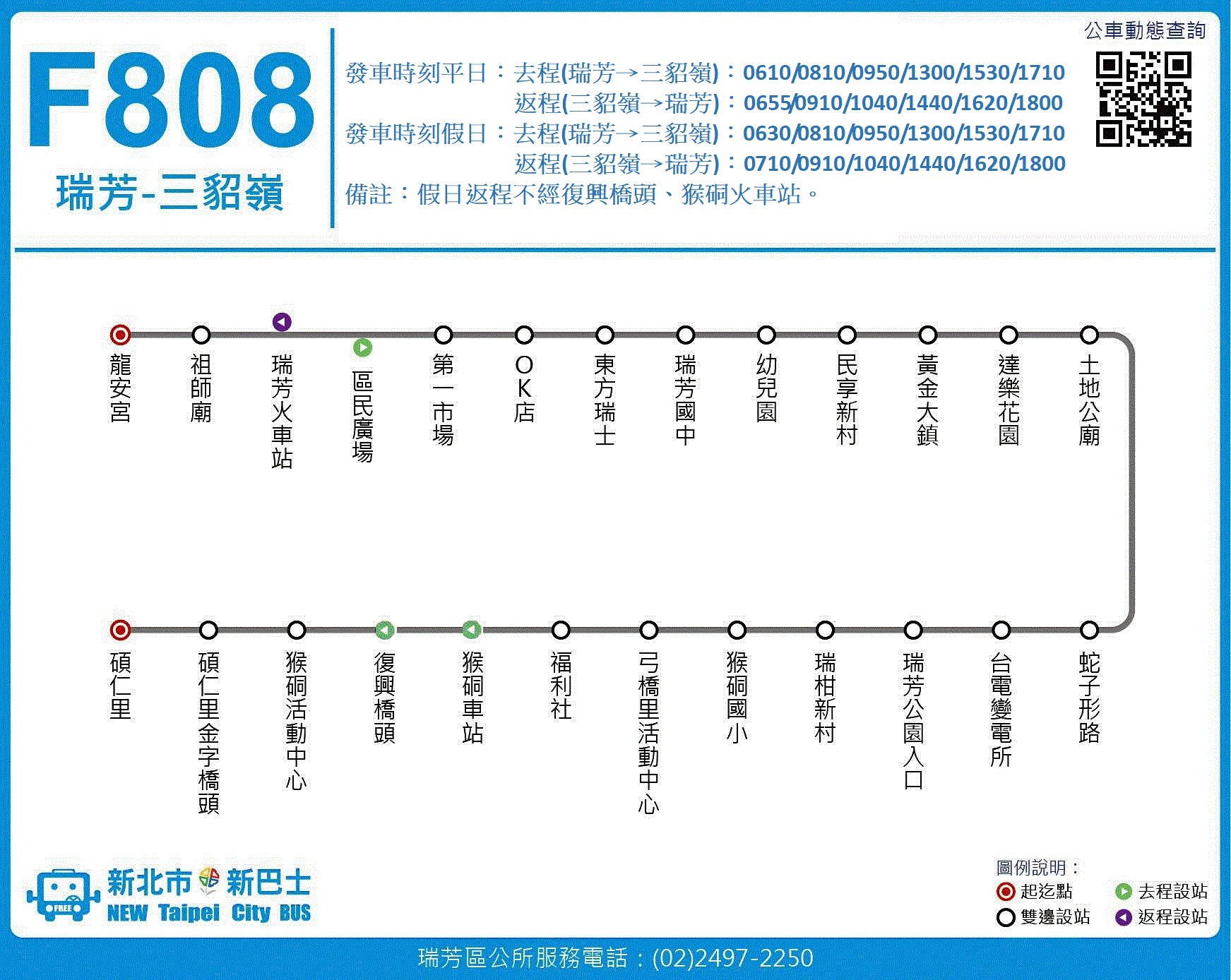 F808瑞芳-三貂嶺:去程(瑞芳->三貂嶺)平日06:10、08:10、09:50、13:00、15:30、17:10;假日06:30、08:10、09:50、13:00、15:30、17:10;返程(三貂嶺->瑞芳)平日06:55、09:10、10:40、14:40、16:20、18:00 假日07:10、09:10、10:40、14:40、16:20、18:00